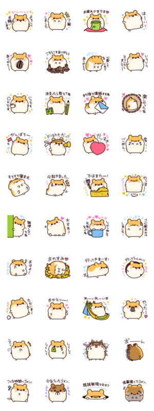 わりと定番なかわいいハムスターのスタンプ。普通に使いやすいものが揃っており、とりあえずで買っても問題ないだろう。「返事遅くてゴメン」など他ではあまり見ないがかなり使うものも。