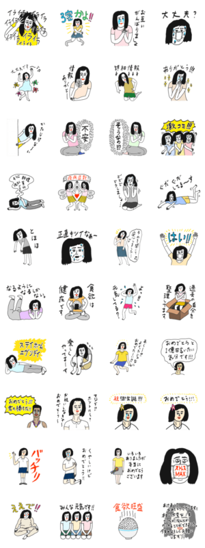 シュール女子のスタンプです。お祝い言葉、自粛生活&コロナ対策向けの言葉いっぱいです。