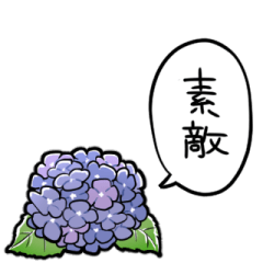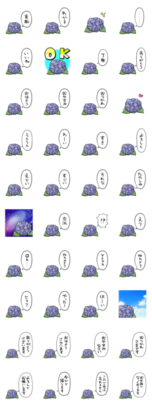 紫陽花好きの方のためのスタンプです。お花屋さんとかあじさいを育てている方にもどうぞ。シンプルで毎日使いやすい基本的な挨拶のフレーズが多めです。オカヤマ より発売