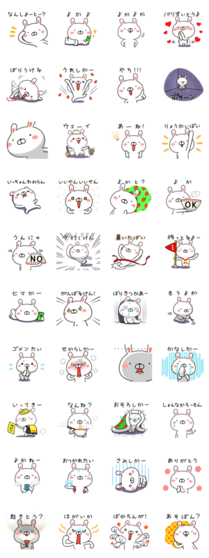九州の福岡県で使われる博多弁(福岡弁)のウサギの方言スタンプ。天神や北九州、小倉などで使われる方言。熊本・長崎・佐賀・鹿児島・宮崎の九州の共通方言をみんなで使おうしん より発売