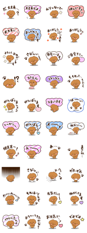 【トイプードル】スタンプの【体調気づかい編】です。体調が悪い時や、相手を励ます時や気にかけてあげる時に便利なスタンプ。犬やトイプードル好きな方にぜひ。【かたこ】