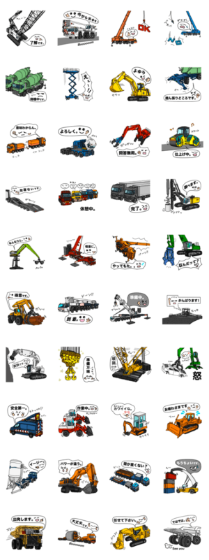 「建機で一言」vol.1 工事現場で働く車編 スタンプ画像一覧