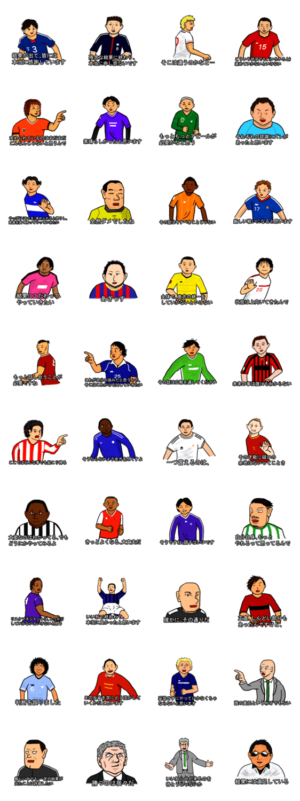 サッカー選手のコメントっぽいスタンプです。(海外の選手の翻訳っぽいもの含む)36~からは監督っぽいコメントです。実在の人物・チームとは一切関係ありません。