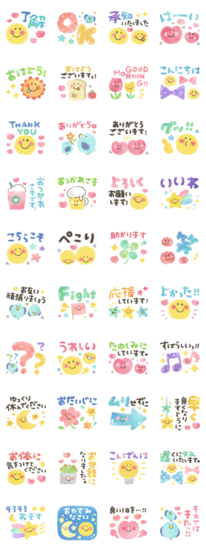 水彩画風のスタンプに、スマイルとトリさんを添えました。水彩タッチの絵文字と合わせてどうぞ。かなぴ より発売