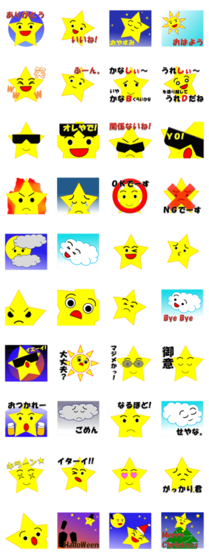 星と友達(月/太陽/雲)のスタンプ。クリスマスやハロウィンのスタンプもあるよ。普段の会話で使ってね。海外限定販売(イタリア、フランス、スペイン、インドネシア)もあるよ有紀恵 より発売