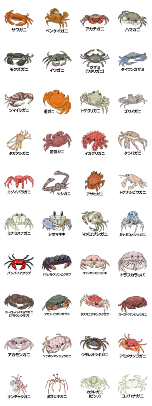 40種類のカニ大集合!甲殻類が入力できるコアなスタンプです。リアルでかわいい顔がまたシュールです。サワガニ、カラッパ、キンチャクガニ、スベスベマンジュウガニ、蟹Hiroki Osawa より発売
