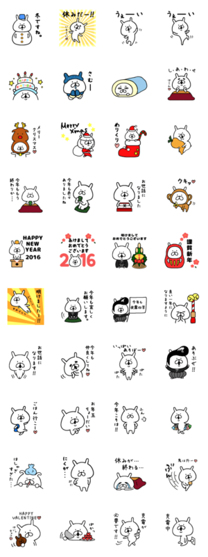ゆるうさぎのスタンプ第7弾。誕生日からクリスマス、お正月に節分、バレンタインまで、冬に使えるスタンプセットです。友達、家族、彼氏彼女との会話に使ってください。