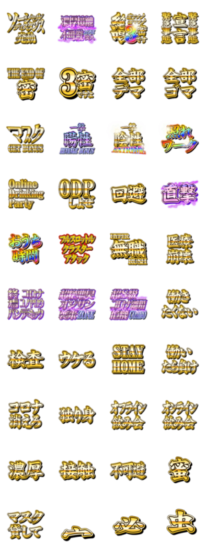 キラキラしている勢いのあるパチンコの様なパワー文字!! 第5弾!!背景無し!! コロナに負けないをテーマに、蜜です3蜜、テレワーク、ステイホームなどを詰め込んでいます。