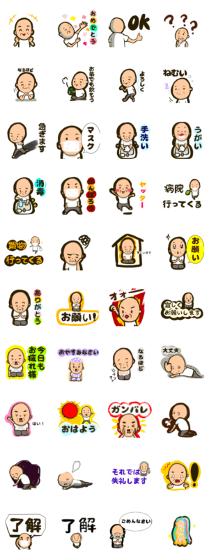 おじいちゃんがよく使うスタンプ第3弾です。おじいちゃん おじい じいじ じいちゃん じっちゃん おやじ お坊さん スキンヘッド ちょいワル 日常 普段使い 手洗いうがい消毒aki より発売
