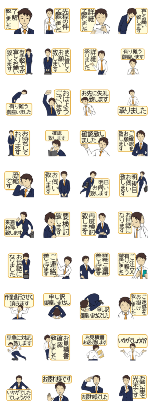 上司やお客様に対して使えるスタンプ集です。文字打ちが苦手な方にピッタリ!忙しいビジネスマンにお役に立てると嬉しいです。