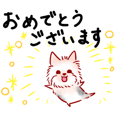 ヨーキーの国からやってきた。おめでたいスタンプです。お祝いしてくれます。お礼や、丁寧な言葉もあったり、ラッパ吹いたり。つまり、ヨークシャーテリア。