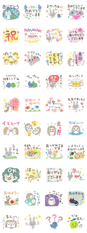 ほんわかした雰囲気のお祝いスタンプです。毎日使えるスタンプ入りで便利です。ひらりーー の大人の気遣いシリーズ6 挨拶/敬語/うさぎ/ふくろう/大人/猫/鳥/ハリネズミひらりーー より発売