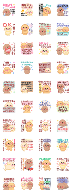 長めの敬語メッセージで気持ち伝わる「かわいいトイプードル」のスタンプです。毎日使える言葉がたくさん!