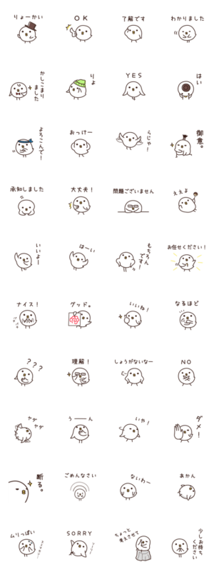 丸くて白い鳥さんがいろんな形で了解します。よく使うりょーかい、OKの他に敬語や英語などいろんな形で肯定!たまに否定したり断る時もあります。気分で使い分けよう♪SofNet Solutions, Inc. より発売