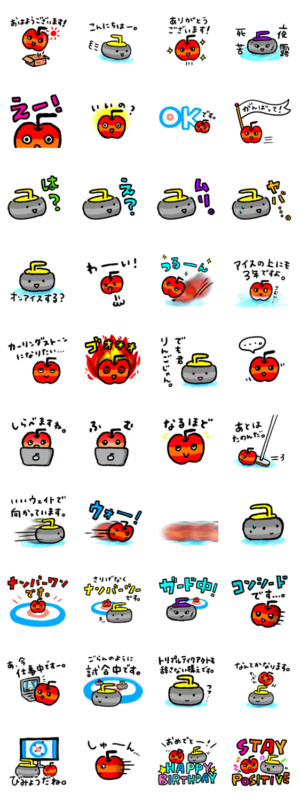 カーリングストーンにを夢見るりんご「かーりんご」のスタンプです。いつでもポジティブ!日曜日のデザイン より発売