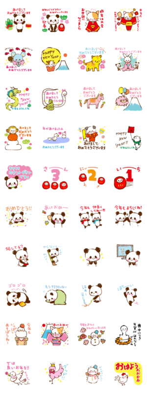 ねずみ、うし、とら、うさぎ、たつ、へび、うま、ひつじ、さる、とり、いぬ、いのしし干支にパンダと猫もいるので毎年使える新年のあいさつ、お正月用あけおめ挨拶スタンプsumire satou より発売