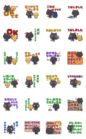 黒猫のアニメーションスタンプ OKです、ありがとうございます、おやすみなさいませ、もうしわけありません、了解しました 日常で使える表現盛りだくさんだにゃー