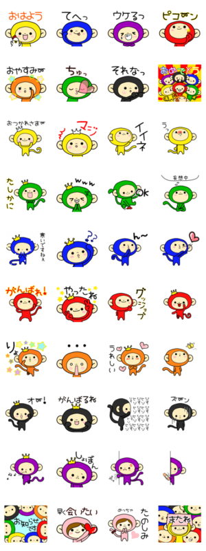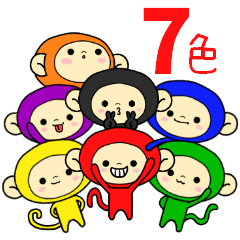 縁起物の七福神と干支の申で、7色の7福猿の日常会話!(黄色・緑・青・赤・橙・紫・黒・プラス桃色)カラフルな万能サル、ホワイトデーにどうぞ!pegのスタンプ第54弾peg より発売