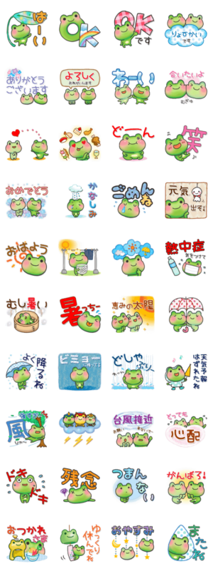 かえるちゃんシリーズ3弾!今回はでか文字です。雨・晴れ・雷・台風など梅雨の蒸し暑い毎日変わるお天気パック。文字が大きいので見つけやすいです!