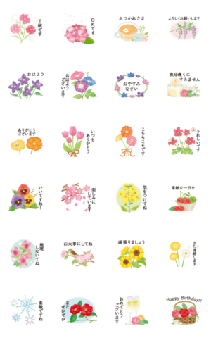 大人上品な挿絵が素敵な毎日使えるスタンプです♪気づかいの言葉や挨拶を集めました。敬語が多めなので色んな方へ送れます。お花、綺麗、感謝、お祝い、優しい