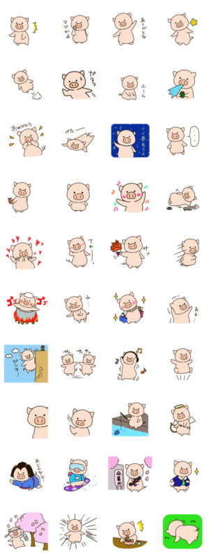 ちょっぴりメタボな豚の、スタンプです無表情だけど、かわいいブタさんスノボや、卒業式、花見など季節のスタンプも入っていますしおまる より発売
