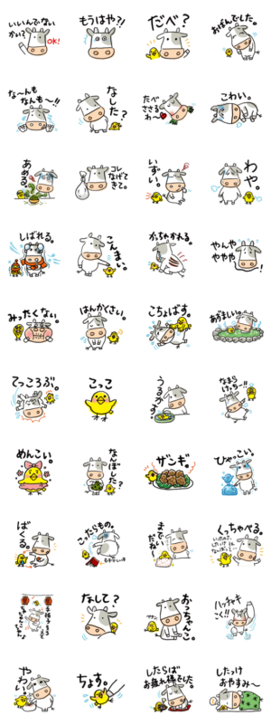 のんびりウシさんと、めんこいヒヨコの北海道弁スタンプです。道民はもちろん、故郷を内地で懐かしんでいる人も使ってください*