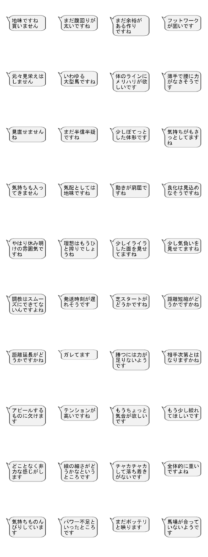 競馬のマイナス実況・解説コメントです。競馬に限らず競馬以外の会話でも使えます。簡単に返信したいときにお手軽で使い勝手がいいです。とっても面白いスタンプです。