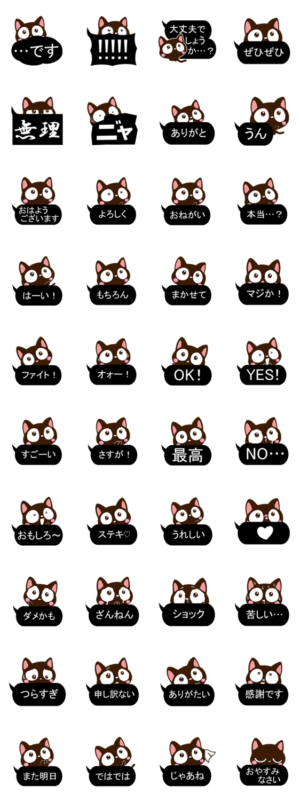 『小さい黒猫スタンプ【黒い吹き出し編】』の別文字版です。黒い吹き出しに、白い文字で目立ちます。黒猫好きな方にぜひ。【かたこ】