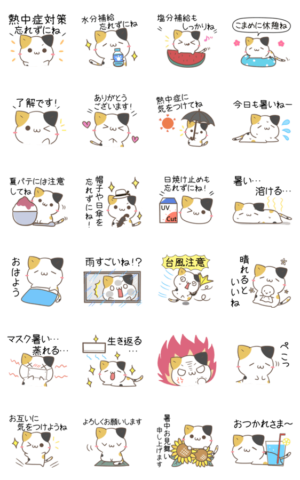 梅雨・夏にかけて新型コロナウイルス・熱中症等の予防・注意喚起に!三毛猫のシンプルで可愛いスタンプ!台風などの災害・日常でも使える敬語&励ましの言葉も