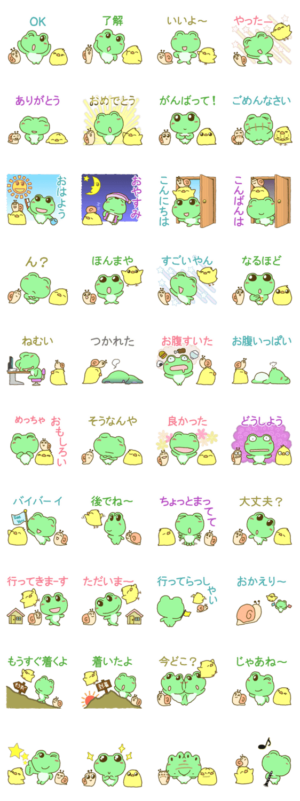 OK,了解,ありがとう,おはよう,おかえり,など人気で日常よく使うスタンプを集めた、かわいいカエルのスタンプです。1スタンプで返信できて便利。家族や友達と毎日使ってね。[STUDIO] UP-imaging より発売