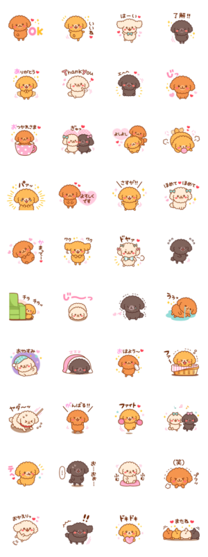 日常で使える便利で可愛いトイプードルのスタンプです♪アプリコット・ブラウン・ブラック・ホワイトなど色んな毛色の子たちが集合!DECOR より発売