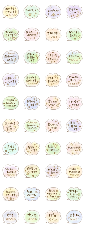 期間限定「あいさつスタンプキャンペーン」の再販です。見やすい太めの筆文字とやわらかな色合いで、目にも心にもやさしいスタンプ。敬語が多めなので返信にも使いやすい♪
