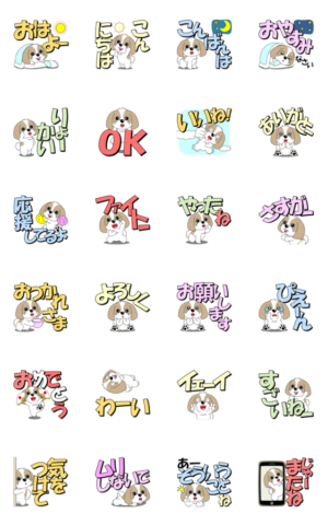 シーズーの「でか文字」スタンプです。日常挨拶など使いやすい言葉を大きな文字で見やすくしました。ヒサケイプリン より発売