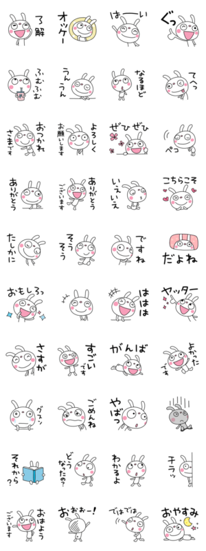 ふんわかウサギ第24弾。あいづち編。「オッケー」「ふむふむ」から「そうそう」まで。あいづちで使いやすい言葉がいっぱい。メッセージにテンポよく返信しよう。