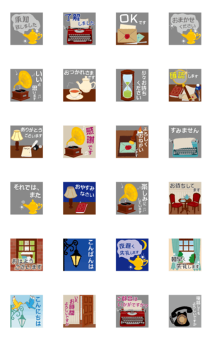 毎日使える、敬語・丁寧語のスタンプ。結構動きます。蓄音機、タイプライター、ティーポット、ランプ等が動くと文字が出ます。落ち着いた色味、キャラ無しで大人にも。きのこのシマ より発売