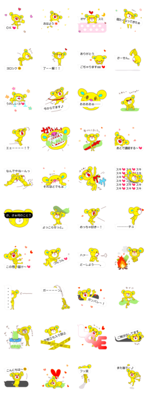黄色のクマのいろんな吹き出しスタンプが楽しめます!もらったメッセージに喜んだり怒ったり燃やしたり♪もらって楽しいスタンプです☆モテキュン!Loveベアも一緒にどうぞりんくちゃん より発売
