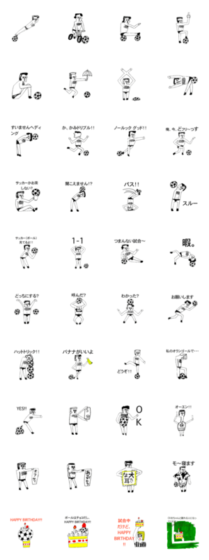 油山のサッカースタンプ。今回は日本語セリフ入りで審判(ラインズマン)もあり、最後の方にサッカー・フットサル好きに送れる、お誕生日おめでとうスタンプもあるよ。
