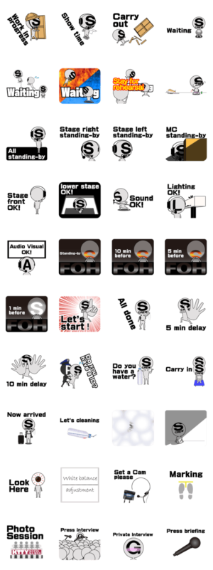 舞台スタッフのやり取りをスタンプにしました。海外の方も使えるように、英語のメッセージでリデザイン!