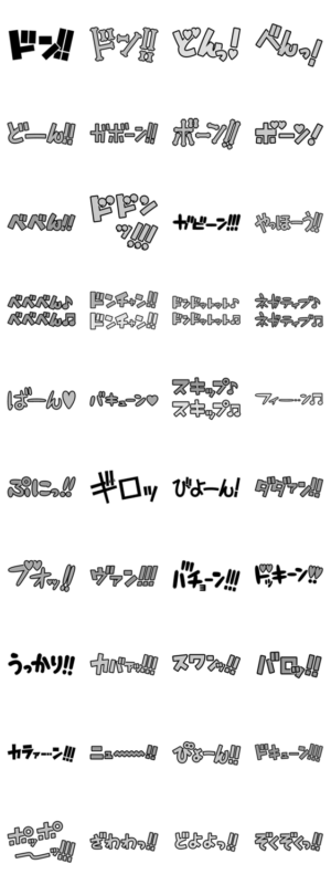 ONE PIECEの擬音語スタンプ。メッセージや他のスタンプと組み合わせて使うと楽しい。ドン!どーん!ガビーン!ガボーン!など、効果音でワンピースのキャラクターがわかるかも