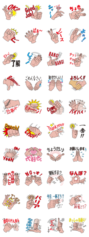 手のジェスチャーで言いたいことを伝える昭和のおじさん的なスタンプです。手だけでも言いたいことってある程度は伝わりますよね?
