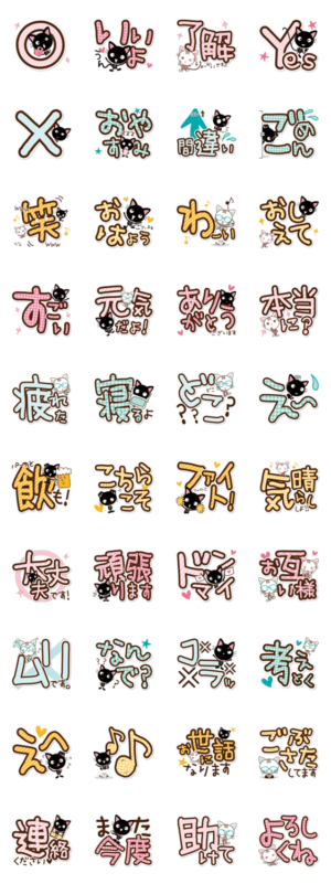 くろ猫、しろネコの大きくてかわいい文字。友達はもちろん年配やシニア世代にも使える。敬語もあるよ。