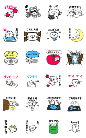 よく使う挨拶を集めてみました。 猫/おはよう/おやすみ/こんにちは/こんばんは/よっ/ちーっす/お疲れ/バイバイ/ハロー/おかえり/おめでとう
