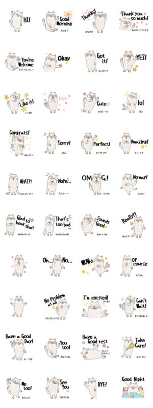 大人が使えるシンプルなにゃん公のスタンプ、英語版です。 使いやすい日常表現を集めました。他の国からきた友人や同僚さんとの会話にどうぞ。ナツ より発売