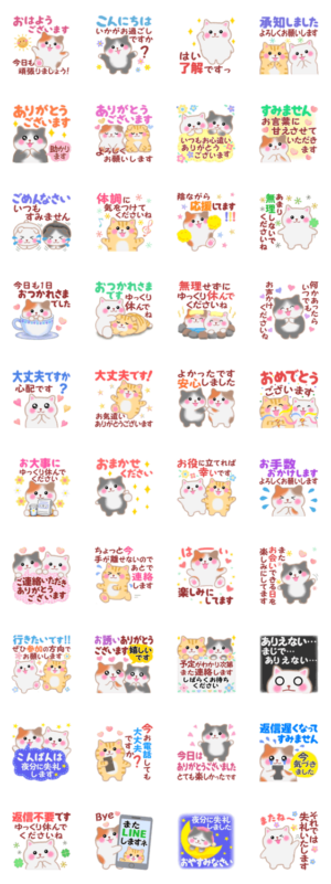 気づかいや挨拶、敬語。日常よく使う長文のメッセージを集めた 4匹のぽっちゃり猫のスタンプです♪めぐみん より発売