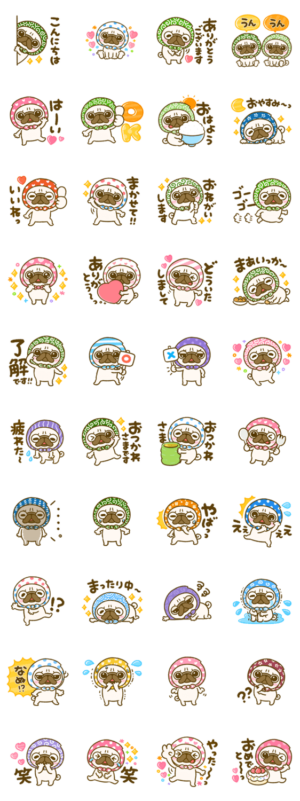 色々な柄のほっかむりをしたパグちゃんのリアクション豊富なスタンプです。ぴよたぬき♡ より発売