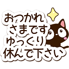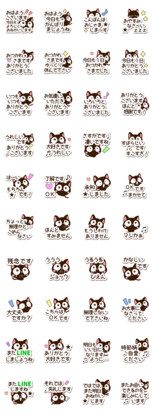 『小さい黒猫スタンプ』から、1回で気持ちが伝わる、長文編になります。大きい文字を規定サイズいっぱいに並べました。文字から、小さい黒猫が顔を出します。【かたこ】