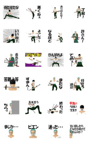 ワンピースのロロノア・ゾロのスタンプです。名セリフや日常会話に使えます。新型コロナウイルス撲滅!