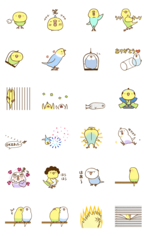 セキセイインコの動くスタンプです。どうぞお楽しみください。花火・土下座・石化・投げキッス・青春走り・おかんインコなど。友情出演にオカメインコと文鳥。