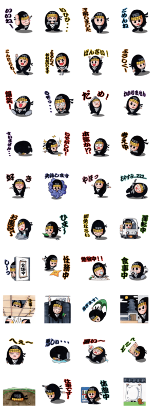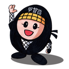 甲賀流忍者のにんじゃえもん。甲賀市甲南町の黒米の田んぼから生まれたご当地キャラクターです。日常に使える忍術スタンプがいっぱいです。myakartstudio より発売