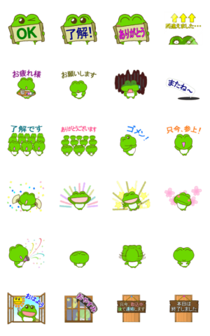カエルのアニメーションスタンプ。サラリーマン、学生さん、家族に送るよく使うスタンプを集めました。動きが面白いので送られた人もニッコリ!毎日使って楽しんでね![STUDIO] UP-imaging より発売